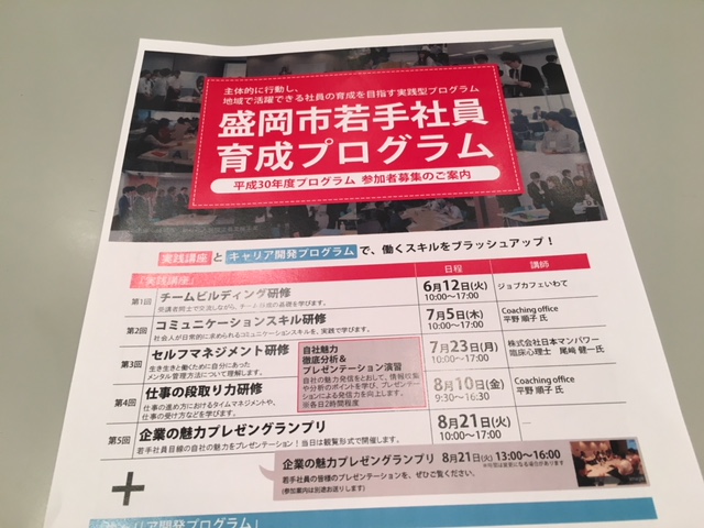 さて、先週は、「盛岡市若手社員育成プログラム」のコミュニケーションスキル研修を担当。こちら、盛岡市内の企業さんに務める若手社員を対象とした盛岡市が主催する研修で、ジョブカフェいわての運営で2011年から毎年実施されています。6月〜8月の3ヶ月間に月に2回ずつくらい集まる連続講座型の集合研修で、キャリア開発をメインにした内容ですが、年によっては盛岡の歴史を知るような内容が入ったり、企業のビジネスプレゼンを聴講する内容が入ったり、いろいろ趣向が凝らされています。