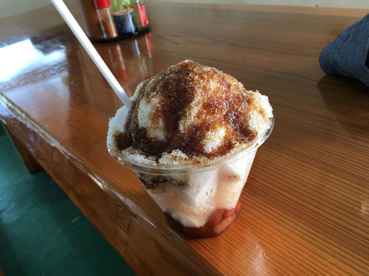 最後に港近くの数少ないお店にて、黒糖ぜんざいをいただきました。黒糖の甘〜いかき氷で底に白玉が・・・これまた美味い。
