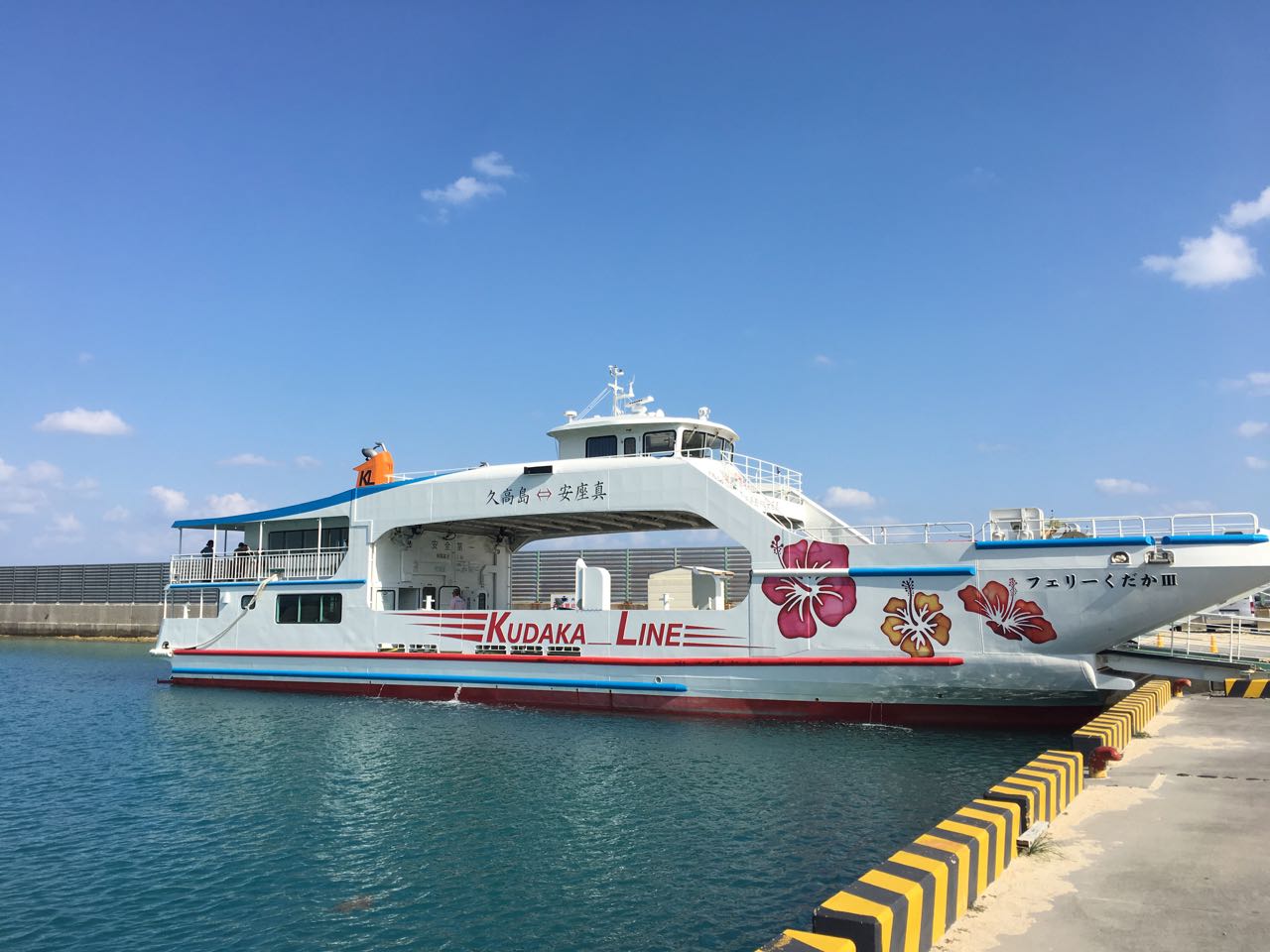 那覇市の中心部から東へ車で45分くらいのところに知念の安座真港がありまして、久高島へはそこからフェリーで25分。1日に5往復くらい出てます。