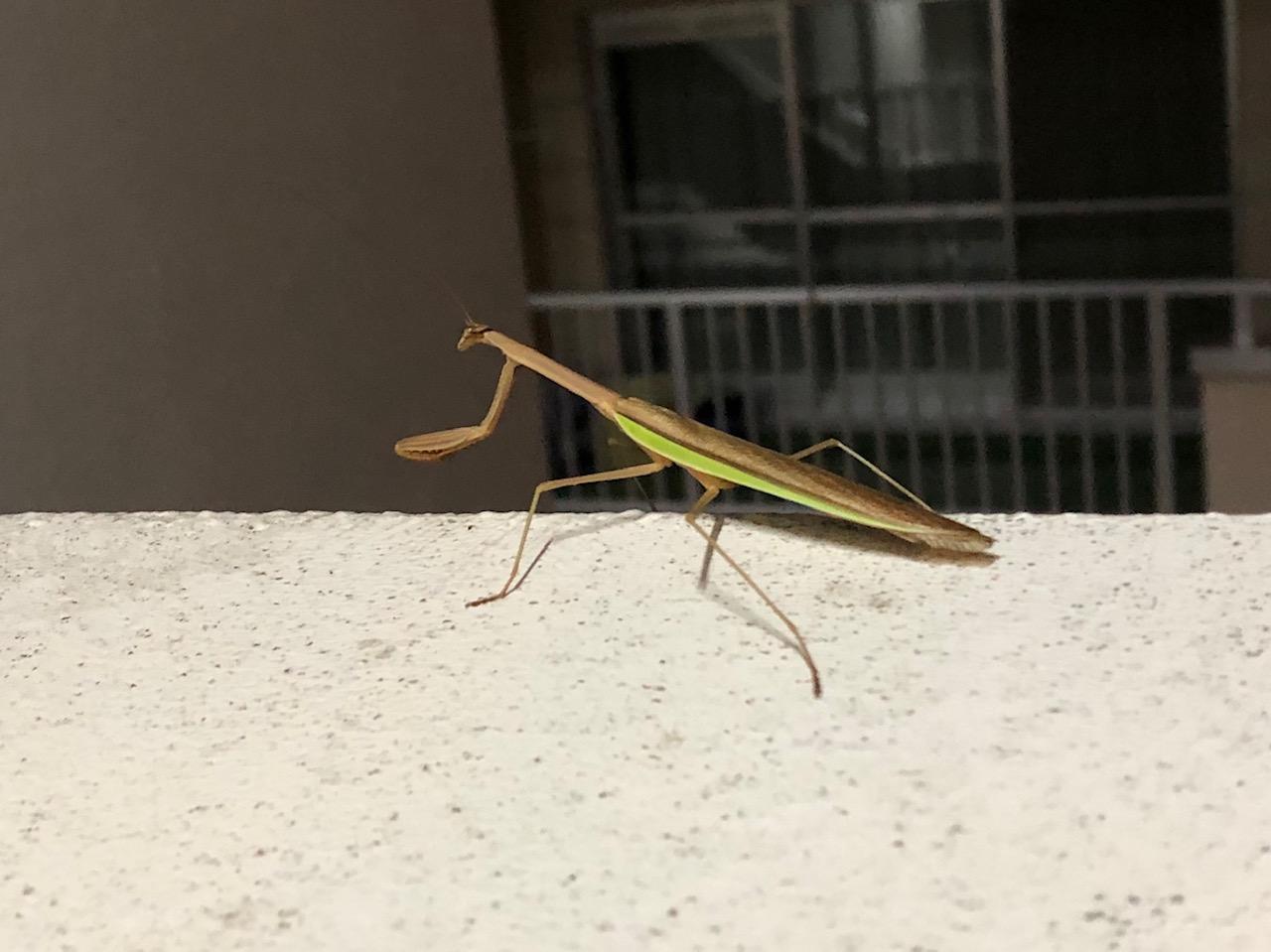 階段で上がってきたのかな? でも、よっこいしょと一段一段上がるのってカマキリさんにとってはかなり大変だよね・・・。たとえ上がれても、非常階段のドアを誰かが開けてくれないとここまで来れないし〜。