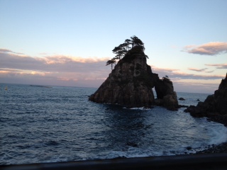それから、山のほうに向かい、滝ダム。海の見えるダム!だそうです~。向こうのほうに見えるのが海です。小さく見える島が牛島・・・牛の頭のように見えるから牛島なんだそうで・・・。って、小さすぎて見えないか・・・。その後、海に向かいまして、小袖海岸。県南の沿岸よりも、ゴツゴツした岩肌が特徴的な感じがします。