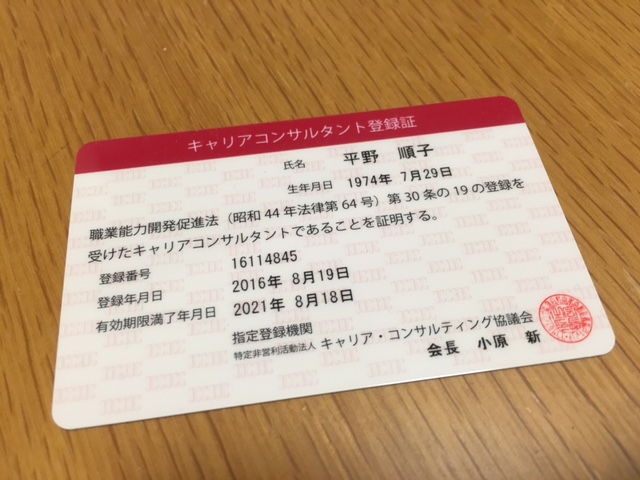 国家資格って聞くとね、お~~すごい~~なんて思ってしまいますが、あらためて試験を受けたわけではありません。今年の4月から「キャリアコンサルタント」が国家資格となりまして、もちろん取得のためには試験があるわけなんですが、すでに取得していた「キャリア・ディベロップメント・アドバイザー」通称「CDA」の有資格者は、申請をすると国家資格の「キャリアコンサルタント」を取得できるというもの。自動的にいただいた形なのでそこまでの感慨はないですが、国家資格っていうと、私の中では「農学修士」(資格というかはわかりませんが)相当なので、一応、特別な感じはします。