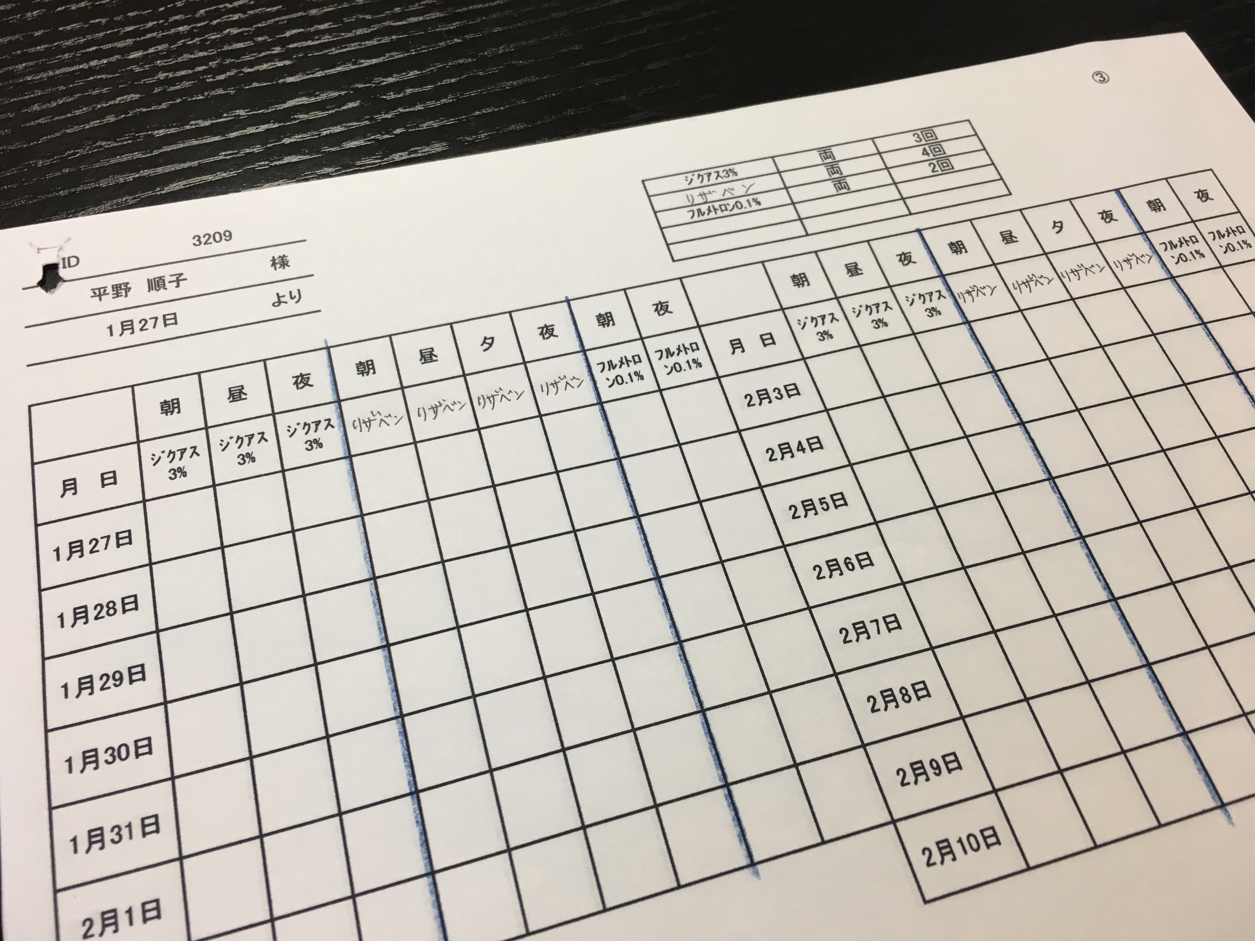 さて、話を戻しますが、お医者さんからブツブツをしっかり治すまでコンタクト禁止令がでました。まずは1ヶ月くらい様子見だって・・・。そんで、処方された目薬が3種類・・・。これがまた、1日の点眼回数が2回のと3回のと4回のがあって、ややこしい~。さらに、点眼が複雑だからなのか、指示通りに点眼したかをチェックするシートまでいただきまして・・・小学生の夏休みの宿題的な・・・(汗)。