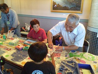 そのロビーでは、「昔あそび手作り教室」が同時開催されていました。フォーラムに集まった子供たちが、盛岡市少年指導員連絡協議会の方々に、昔のおもちゃの作り方を教わりながら一緒に作って遊ぶ、というものです。最初は照れくさそうに逃げ腰で様子を見ていた子供たちですが、竹とんぼや割り箸鉄砲など、見たこともないおもちゃに引っ張られるように徐々に寄ってきます。ご年配の協議会の方々はまるでマジシャンのようで、次から次へといろいろなおもちゃが出来上がります。その発想はとても柔軟で、さらに楽しく、そして安全で使いやすくなるような工夫がどんどん施されていきます。そして、子供たちはのめり込むように作り始め、気がつくと、ロビーには、割り箸鉄砲を持つ子供たちが駆け回り、鉄砲玉の輪ゴムや竹とんぼが飛び交っていました・・・。