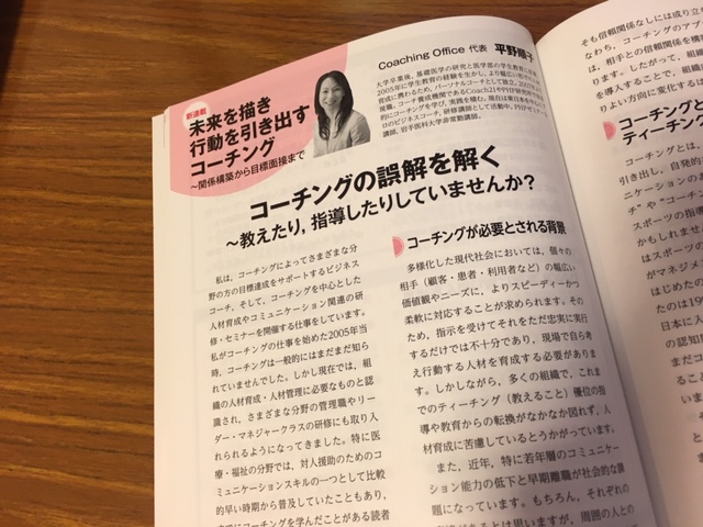 最初に連載のお話をいただいたのが、5月。看護の分野ではコーチングはそこまで目新しいものではないのですが、最近は目標面接が上手くいかないというお悩みが多いようで、ここで今一度コーチングをテーマに取り上げようということになったとのこと。世の中、コーチングをお仕事にしている方はたくさんいらっしゃるでしょうに、そこで私にこのお話が来たというのは、人の繋がり、ご縁としか言いようがないです。一応、医学部での研究の経験があるので、多少医療にも関わりがあるということも理由の一つかもしれませんが、何にしても大変光栄なことです。