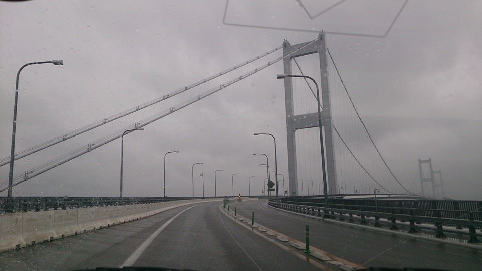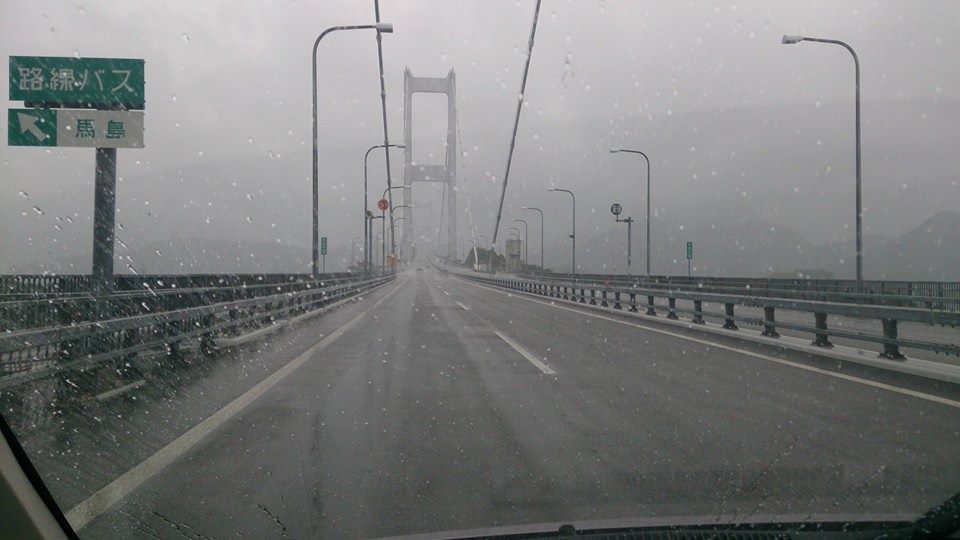 ここからはまさにサバイバル。台風と追っかけっこ。感覚的には、常に暴風域の境目くらいの位置を台風に追われるように北上して行った感じです。数日前はあんなに綺麗だったしまなみ海道も、嵐の真っただ中。一度、走った道じゃなければ、走るのかなり大変だっただろうなと思います。ちなみに、私が運転していたので、写真は助手席の友人が撮影。