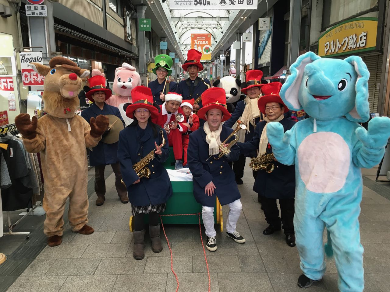 天皇誕生日で祝日の昨日は、毎年恒例、肴町商店街 ”らっぱ隊” のクリスマスパレード〜。ブラスバンドでクリスマスソングを演奏しながらアーケードをパレードするのですが、パレードと一緒にソリを引いて子ども達を乗せたり、お菓子を配ったりします。私が加わったのは4年前からですが、結構、長くやっているイベントです。