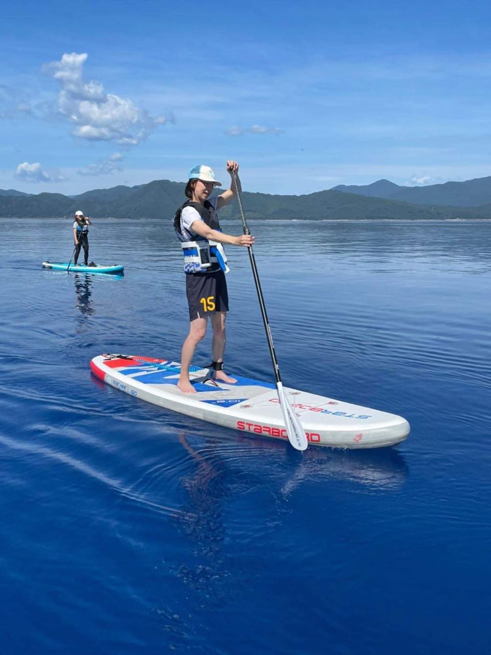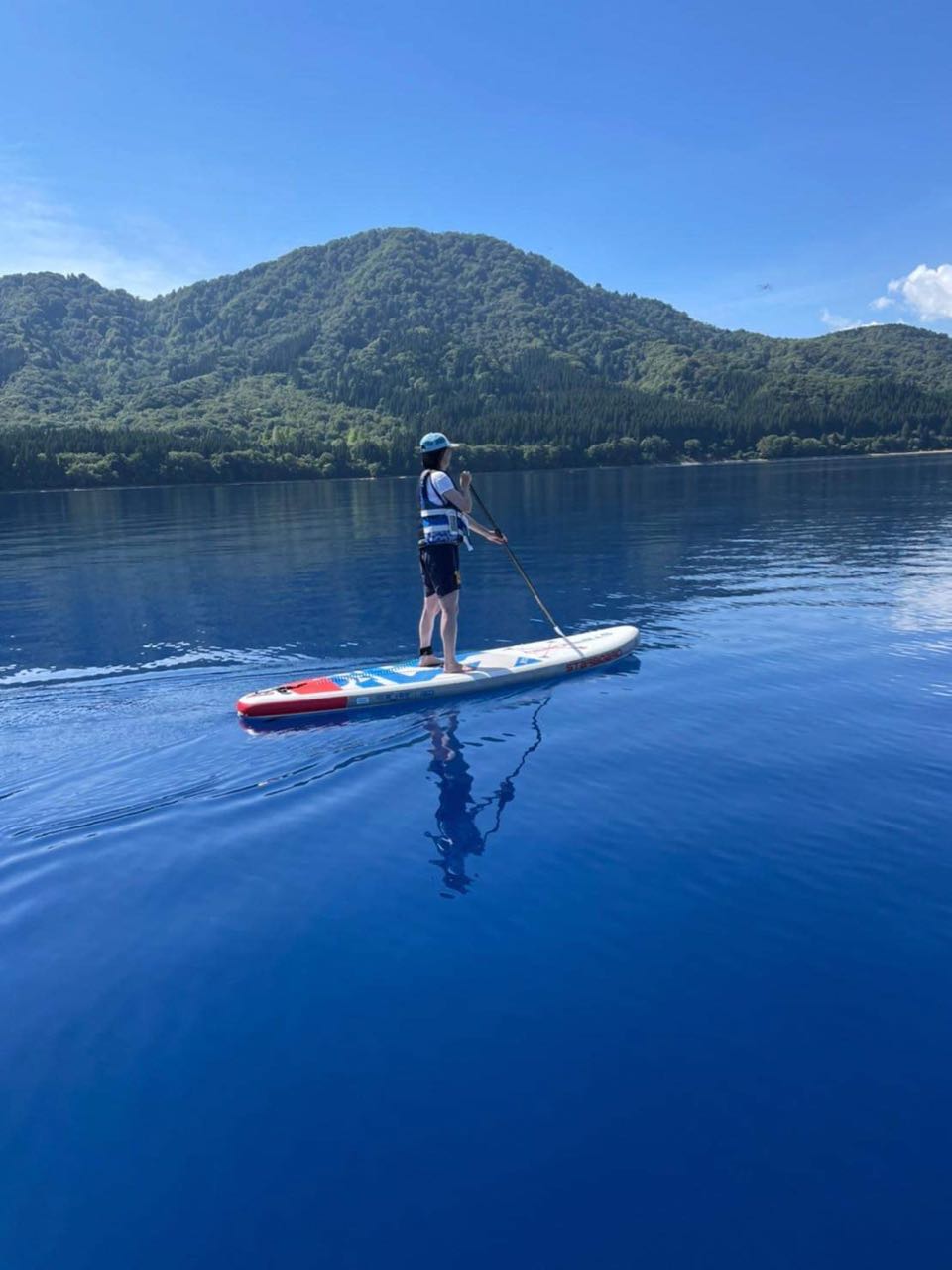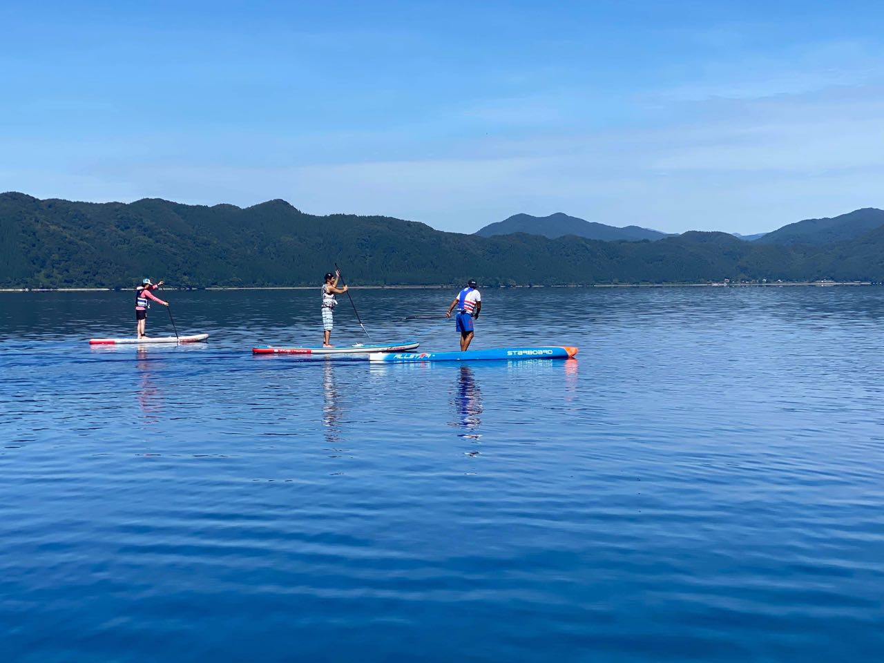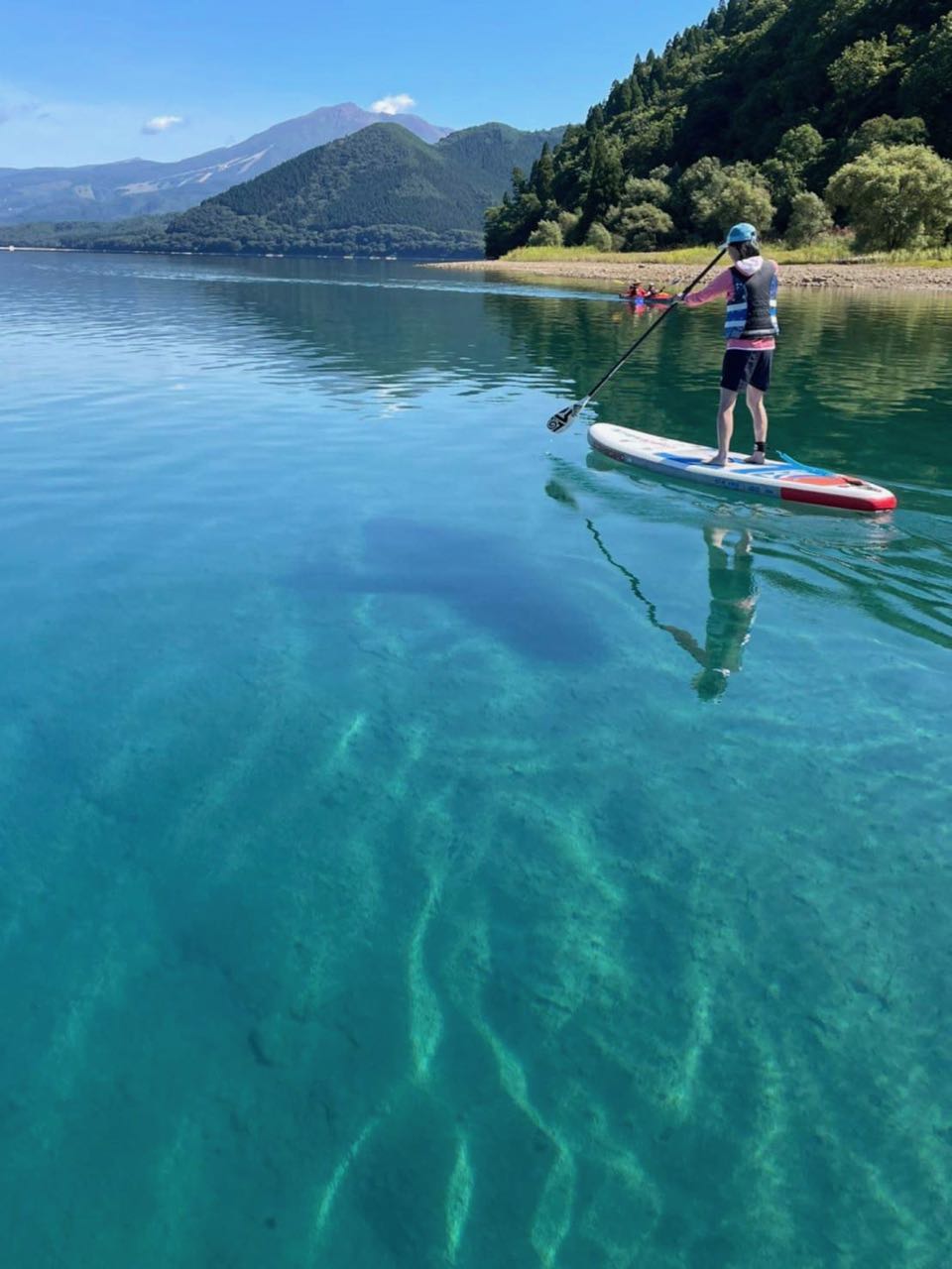 SUPを漕いで進む楽しさもさることながら、自然の中にいるな〜〜って感じの心地よさが最高。湖の上に立っていることそのものが、なんか不思議な感覚というか、当たり前だけど普段には味わえないことなので、面白い。特に昨日は、天気は快晴、気温は暑すぎず寒すぎず、ほぼ無風。SUPするにはベストコンディション。なんとも引きの強い私。空は青いし、水は綺麗だし、湖面に山や雲が映って、とても綺麗。田沢湖は透明度が高いらしく、浅瀬では泳いでいる魚がすっかり見えるほどです。