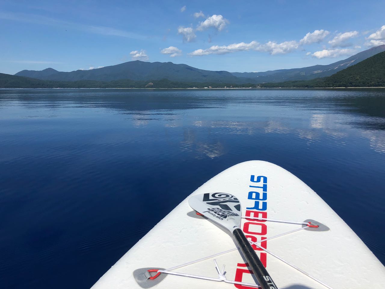 湖の中程まで行って、漕ぐのを少し休んでボードに座り、遠くの山やキラキラする湖面をぼーっと眺めていると、時間を忘れてずっと佇んでいたくなります。マイナスイオンをたっぷり浴びて、すんごい癒された感じ〜。
