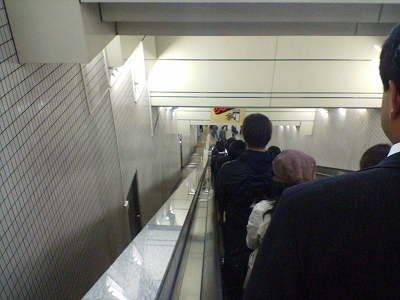 丸の内線から半蔵門線に乗り換えて、ホームまで降りるときのエスカレーターがこちら。いったいどこまで降りるんだ~という深さです。昔は少し怖かったのですが、最近は慣れてしまいました・・・。この長さなのに、右側を駆け下りていく人がいるのにはびっくりです。