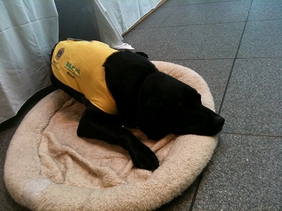 特にも、ご主人がお仕事などをしている間、何時間もずっと待っていなければいけないときもあるので、一人?でごろごろしているのが苦痛じゃない犬が向いているんですって。たしかに・・・。