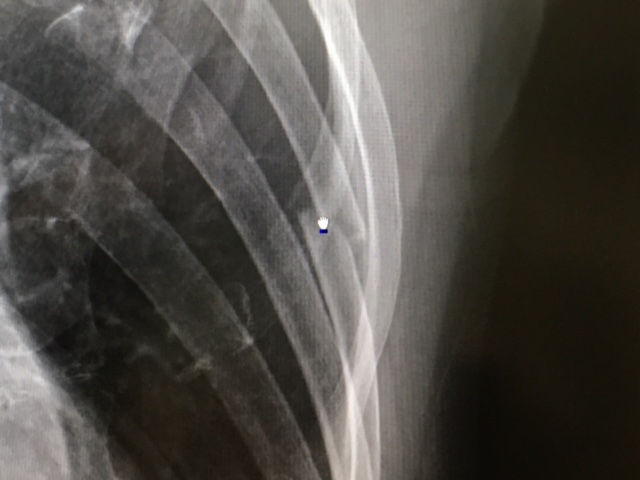 パソコンのカーソルがあるところが5番目の肋骨で、見事にポッキリ・・・はい、折れてますねと。実は、このときにはわかりませんでしたが、右隣の4番目にも亀裂が入っていたもよう。当時は、くしゃみなどの特定の動作をした時に激痛。胸にゴムバンドみたいなものを巻いて動きを制限しつつ、鎮痛剤を飲み、湿布を貼って過ごす(涙)。
