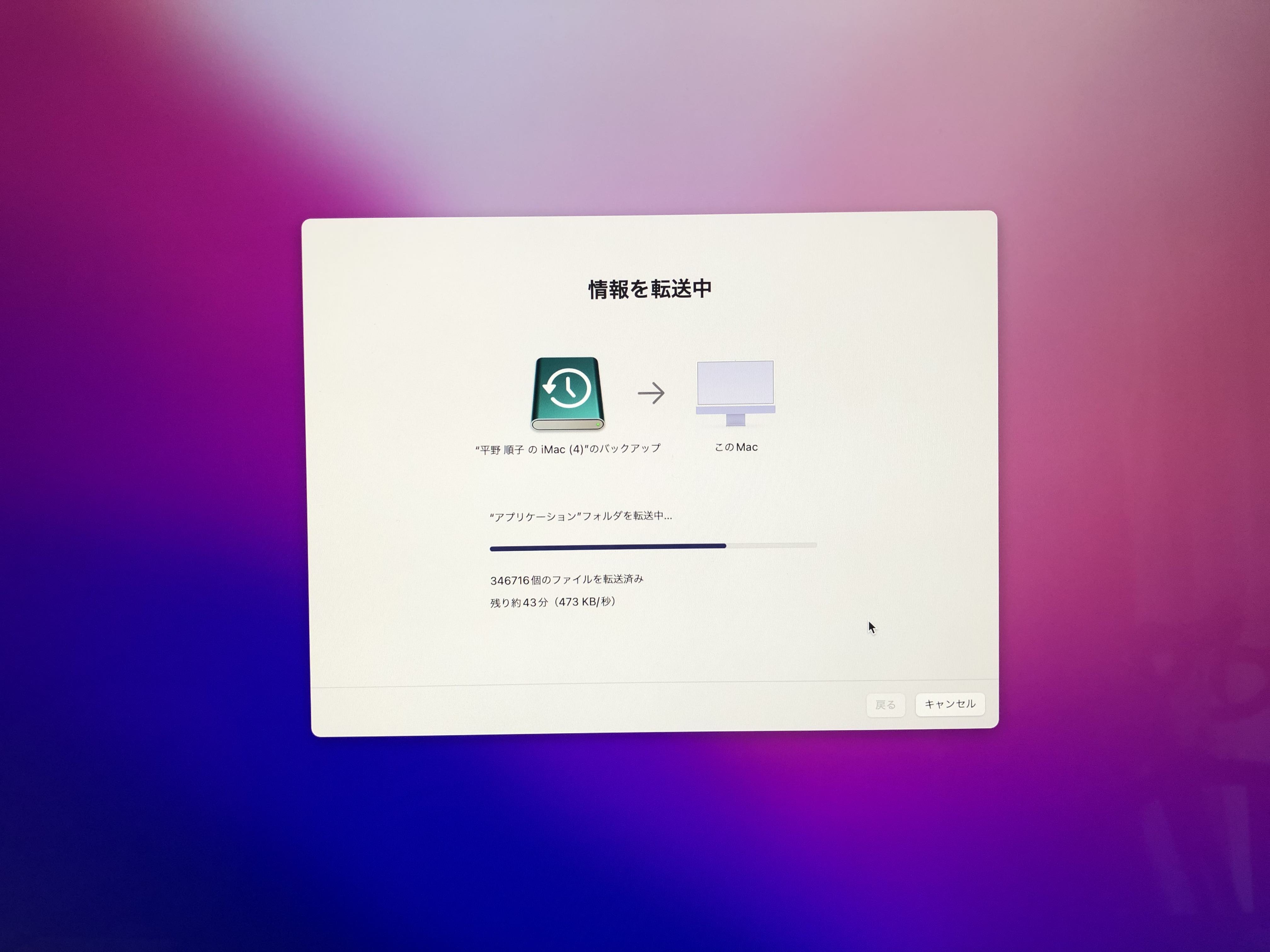 さてさて、ウキウキ気分でセッティング作業を開始したわけですが、さすがに簡単には終わるはずもなく・・・。今回の大問題は、やっぱり移行する容量の大きさ。Macの便利機能であるTime Machineは、どんどんバックアップをとってくれるわけですが、長く使えば使うほど、ぜ〜〜んぶ溜め込んでしまうわけで、実はもはやいらない何かもず〜〜っとあることにあります。それによって容量がかさみ、移行作業も気が遠くなる時間がかかります。